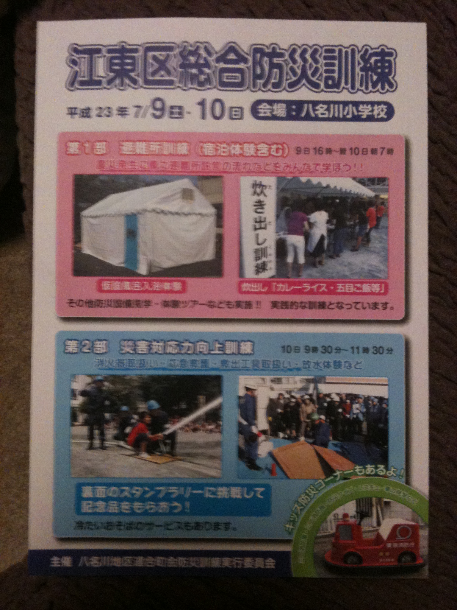 八名川地区のみなさんに限定のお知らせ。 江東区から以下のようなお知らせが各家庭に配布されているかと思います。 具体的なスケジュールがわかりにくいかと思いますのでお知らせします。 お子様と一緒に避難所体験を通じて、被災地の避難所の方々への理解や 共感を作る意味をあるかと思います。 是非ご参加ください。 写真がピンボケでごめんなさい。
